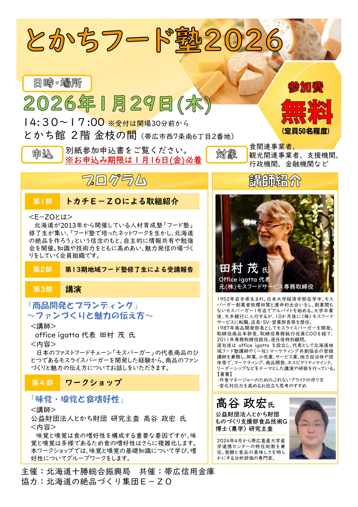 道では中小・小規模食関連事業者を対象に、食をめぐる情勢の変化に対応できる志を持った地域のキーパーソンをとなる人材を育成する食クラスター「地域フード塾」を実施しているところですが、本取組を十勝地域で共有するため、下記のとおり「とかちフード塾2026」を開催することとしました。