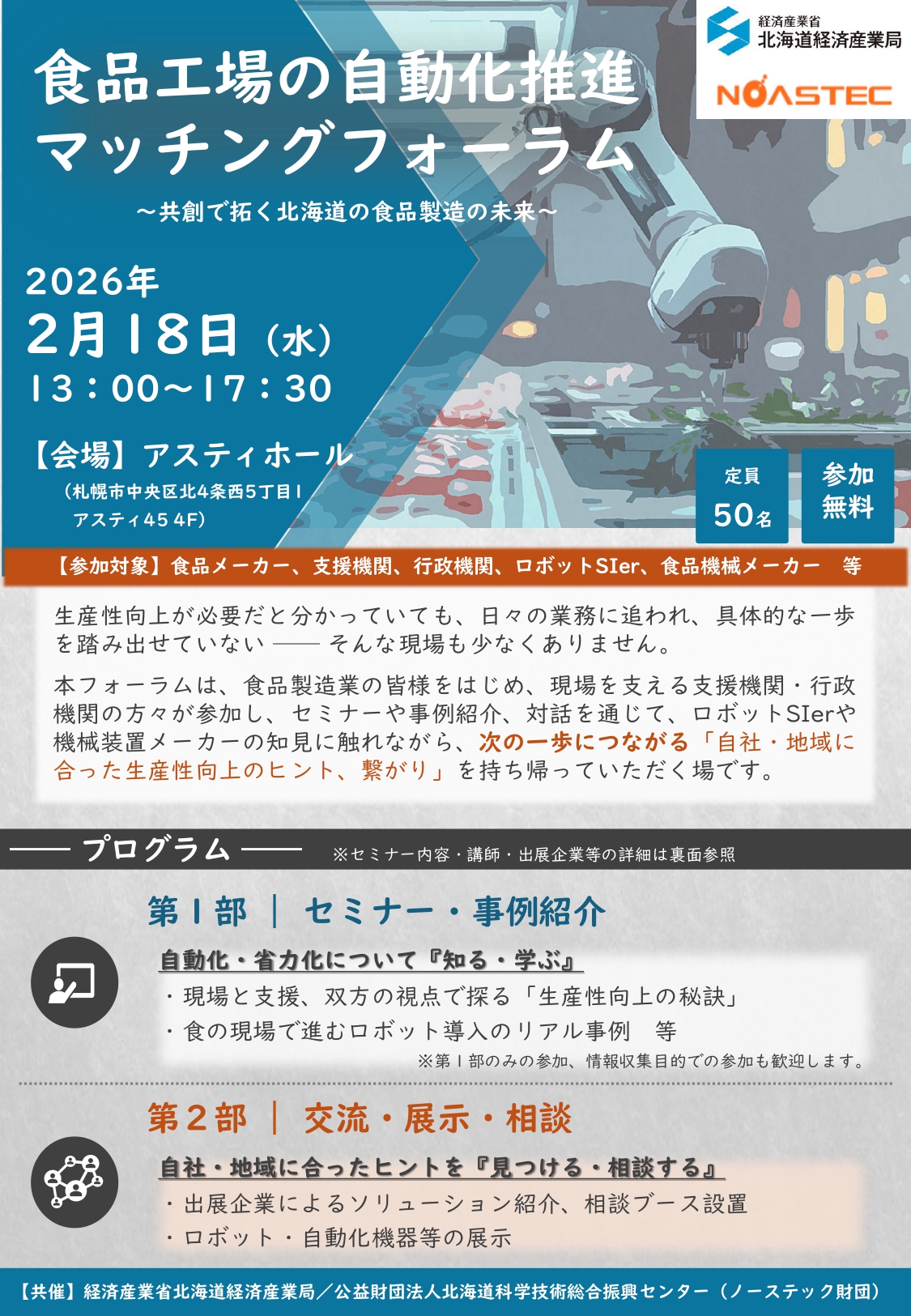 経済産業省北海道経済産業局では、「食品工場の自動化推進マッチングフォーラム 〜共創で拓く北海道の食品製造の未来〜」を開催します。