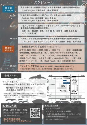 | 14:55~ | 情報提供「北海道における食品製造分野の省力化推進体制構築に向けた取組み」 |