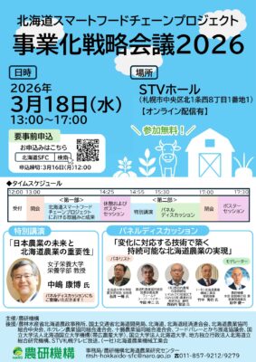 農研機構では、北海道における農業産出額の2割を占める十勝地域において、「農業・食品版のSociety5.0」の早期実現を加速化させることにより、農畜産物の生産性及び収益の向上を図り、農業・食品産業の競争力強化及び産業振興を通じて地方創生に貢献するため、令和4年3月から「北海道十勝発スマートフードチェーンプロジェクト」を開始し、令和6年4月から名称を「北海道スマートフードチェーンプロジェクト」と改め全道展開しています。